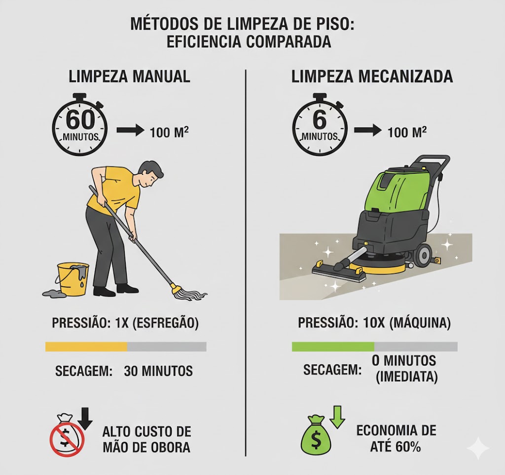 Você ainda perde horas esfregando pisos manualmente e aguardando a secagem natural? Se a resposta for sim, sua empresa está literalmente jogando dinheiro pelo ralo. A limpeza mecanizada não é apenas “conforto”, é matemática financeira básica: as melhores lavadoras e secadoras de piso elétricas entregam 10x mais pressão de contato que um esfregão comum e reduzem o tempo de operação em até 60%.